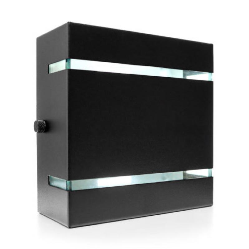 NÃO ACOMPANHA LÂMPADA Cor: Preta Textura: Micro corrugada Dimensões: L 120mm, A 120mm, P 50mm Extra: Não oxida ao ficar no tempo Efeito: 2 fachos x 2 frisos Uso: EXTERNO E INTERNO Fixação: Aparafusável Material: Alumínio e vidro Conformação: Estampagem e solda Tinta: Epóxi Soquete: G9