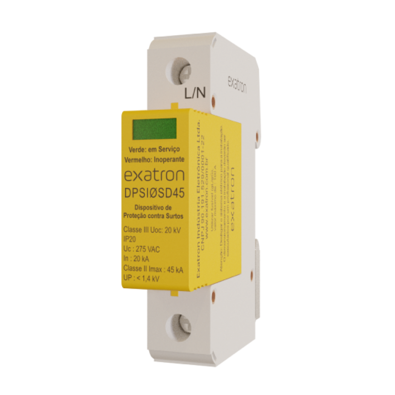O Dispositivo de proteção contra surtos é um equipamento monopolar com tecnologia MOV (ZnO), capaz de limitar surtos elétricos em instalações de baixa tensão, provocados por descargas atmosféricas e manobras no sistema elétrico. Este equipamento possui um dispositivo termomecânico que sinaliza o estado de funcionamento. • Tempo de resposta: < 25 ns.• Seção dos condutores de conexão: 10 mm² a 16 mm².• Torque de aperto dos terminais: 5 Nm. • Fixação: Trilho DIN 35 mm.• Dimensões: 90 X 68 X 18 mm.• Módulo de reposição plugável.• DPS Classe 2 e 3. Instalação: A instalação do DPS é em paralelo aos circuitos e não interrompe a corrente elétrica caso o mesmo esteja fora de operação. Tipo de ligação utilizada quando o condutor neutro for aterrado.